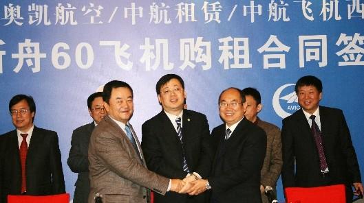 2013年1月18日,奧凱航空與中航國際租賃公司、西安飛機國際航空制造股份有限公司在北京簽署3架新舟60飛機購租合同。奧凱航空總裁劉偉寧;西飛集團公司總經(jīng)理、黨委書記、中航飛機西飛黨委書記宋水云;中航租賃總經(jīng)理趙宏偉等領(lǐng)導(dǎo)在購租合同上簽字。