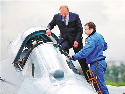 俄羅斯首都莫斯科市郊外的茹科夫城,普京(左)參觀由俄羅斯蘇霍伊公司研制的第五代隱形戰(zhàn)斗機T-50。 新華社發(fā)