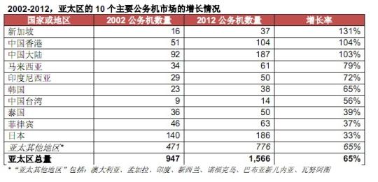 2002-2012,亞太區(qū)的10個主要公務(wù)機市場的增長情況
