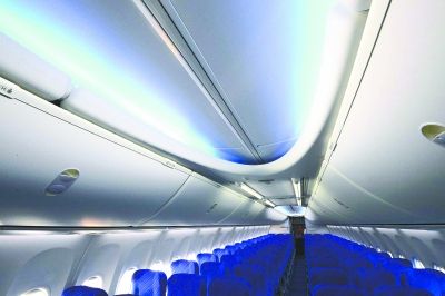 “這架飛機(jī)內(nèi)飾有很大不同,燈光不再是刺眼白色,有白天、夜晚模式,十分柔和!”蔡治洲說,采用天花板凹形LED燈光照明,根據(jù)登機(jī)、起飛、用餐、休息等不同飛行階段或服務(wù)階段,選擇不同的燈光顏色和明暗度模式。在夜間飛行時(shí),客艙燈光光線由亮變暗,襯托藍(lán)色背椅,如同在藍(lán)色海洋,十分溫馨。行李架改為下拉式的,更易打開。
