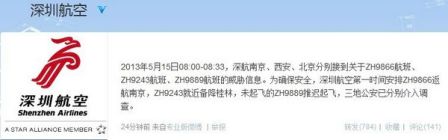 圖說(shuō):深圳航空官方微博稱(chēng)三航班收到威脅信息。 來(lái)源:新浪微博