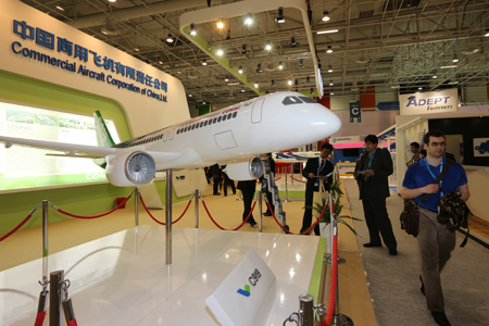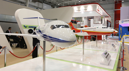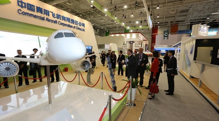這是中國商飛公司第2次參加巴黎航展,中國商飛展臺位于巴黎航展展館5號館B片區(qū),面積約250平方米,展示了C919大型客機模型和ARJ21-700飛機模型。在此次展示的飛機模型中,全面展示了C919大型客機混合級布局,ARJ21-700飛機混合級、全經(jīng)濟級、行政機和公務(wù)機布局。