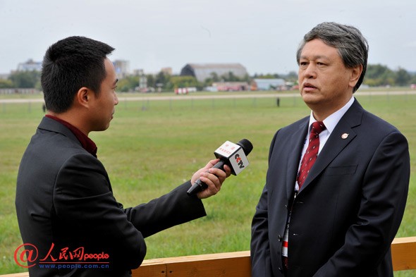 2013年8月27日上午,中國(guó)航空技術(shù)國(guó)際控股有限公司董事長(zhǎng)馬福安(右)在第11屆莫斯科航展上接受中央電視臺(tái)記者采訪。 攝影:人民網(wǎng) 楊鐵虎