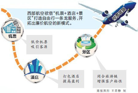 廉價航空如何構(gòu)建自己的商業(yè)生態(tài)?這是宣布轉(zhuǎn)型低成本后的西部航空的一大難題。昨日,商報記者獲悉,為打開局面,西部航空宣布拉長產(chǎn)業(yè)鏈,進軍旅游市場,將重點打造“機票+酒店”的組合旅游模式,探路低成本航空運作商業(yè)生態(tài)鏈。這意味著西部航空的盈利觸角,將延伸到下游的在線旅游市場。對此,在線旅游服務(wù)企業(yè)表示,歡迎航空公司打包產(chǎn)品通過他們來銷售,但航空公司若想壟斷資源來搶食,恐不受歡迎。