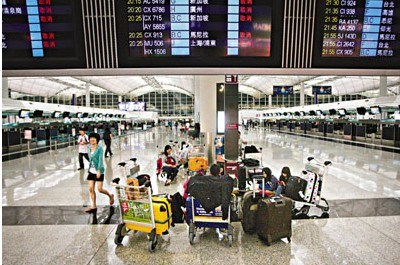 香港機場更陷入癱瘓狀態(tài),截至22日晚9時,共有370班客機取消,76班客機延誤。雖然國泰及港龍航空早在30小時前,于臺風到達香港范圍前一日,已宣布取消22日下午6時后所有航班,但在機場離境大堂內仍有大量旅客等候辦理候補機位,希望盡快離港。
