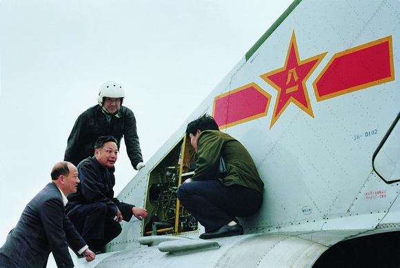 殲-8飛機(jī)0102號(hào)機(jī)試飛中,顧誦芬與飛行員和技術(shù)人員一起研究排除故障!