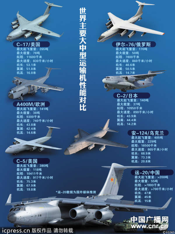“運(yùn)-20”,機(jī)體長47米,翼展45米,高15米,實(shí)用升限是13000米,最高載重量是66噸,最大起飛重量220噸,因此躋身全球十大運(yùn)力最強(qiáng)運(yùn)輸機(jī)之列!斑\(yùn)-20”的首次飛意味著中國空軍向戰(zhàn)略空軍邁出了堅(jiān)實(shí)的一步。