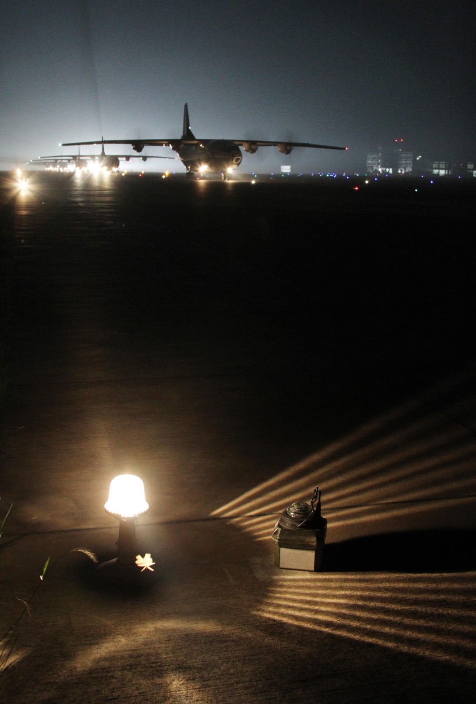 大機(jī)群戰(zhàn)機(jī)整裝列陣,執(zhí)行夜間投送任務(wù)訓(xùn)練。