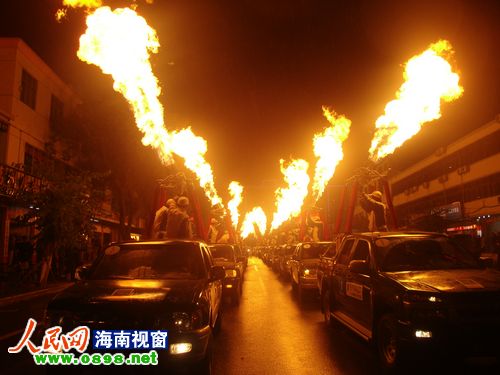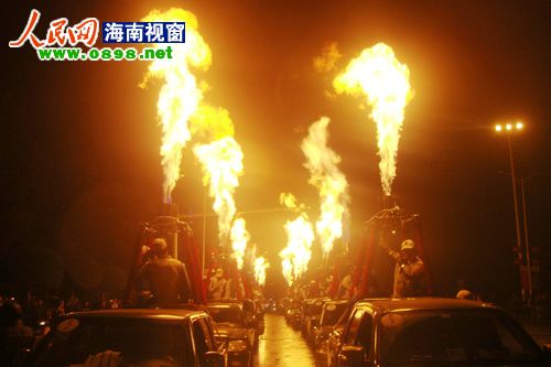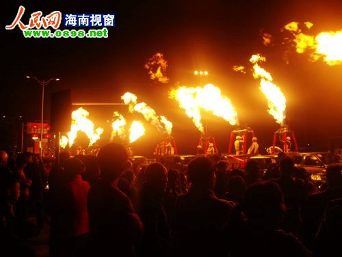 26日晚8點左右,2011環(huán)海南島飛行拉力賽萬寧段的首場活動——熱氣球噴火表演游行在萬寧市區(qū)上演。當晚,萬寧市區(qū)飄起了毛毛細雨,20個熱氣球組成的方陣從萬寧市人民中路與萬州大道交叉路口出發(fā),以人民公園為終點。在充滿動感的音樂聲中,熱氣球進行了多種樣式的噴火表演,交叉噴射,雙向噴射,搖擺噴射……整齊劃一的火柱照亮了萬寧的夜空,熾熱耀眼的火焰蒸發(fā)了綿綿的細雨。眾多萬寧市民早早守候在萬州大道兩旁,欣賞這難得一見的場景。方陣經(jīng)過的每個地方都引起尖叫聲一片,整條街道歡樂的氣氛達到了沸點。