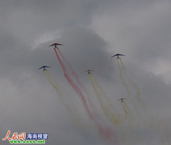 29日的萬寧晴空萬里,飛行特技運(yùn)動員們早早便做好了準(zhǔn)備,熱氣球、動力滑翔傘、三角翼、航空模型等飛行器材也準(zhǔn)備完畢,早上10點(diǎn),隨著歡樂的音樂響起,率先飛過場地的是捧著彩帶的三角翼編隊。