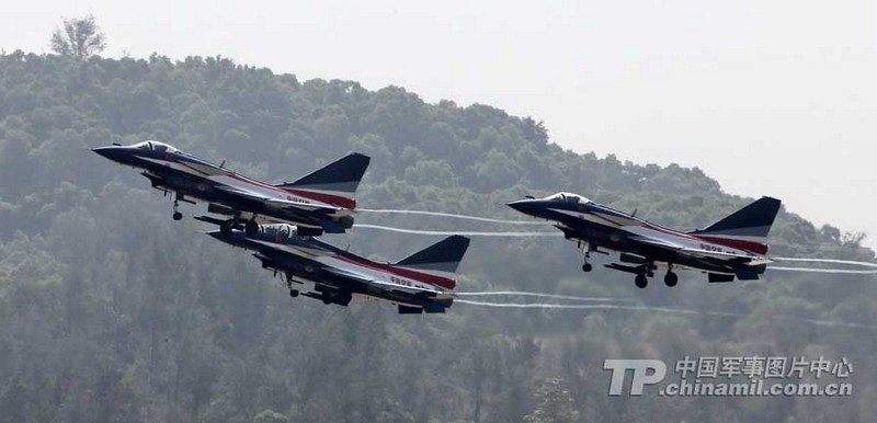 第9屆中國航空航天博覽會開幕在即。中國人民解放軍空軍八一飛行表演隊已到達珠海機場。 11月10日,珠海機場多云,八一飛行表演隊的飛行健兒進行了“熱身訓練”。記者在現(xiàn)場記錄了他們駕駛殲10戰(zhàn)機在云中穿梭的情景。親眼見證 “三機箭隊起飛”、“4機菱形隊斤頭”、“5、6號機繞軸滾轉”、“4機菱形放起落架斜盤旋”、“4機疊羅漢”等新增的高難度動作的風采。(來源:中國軍網(wǎng))
