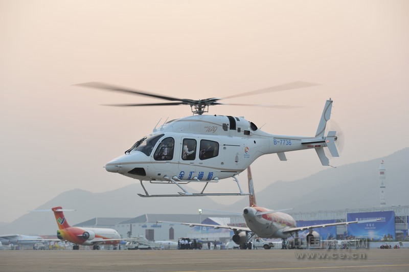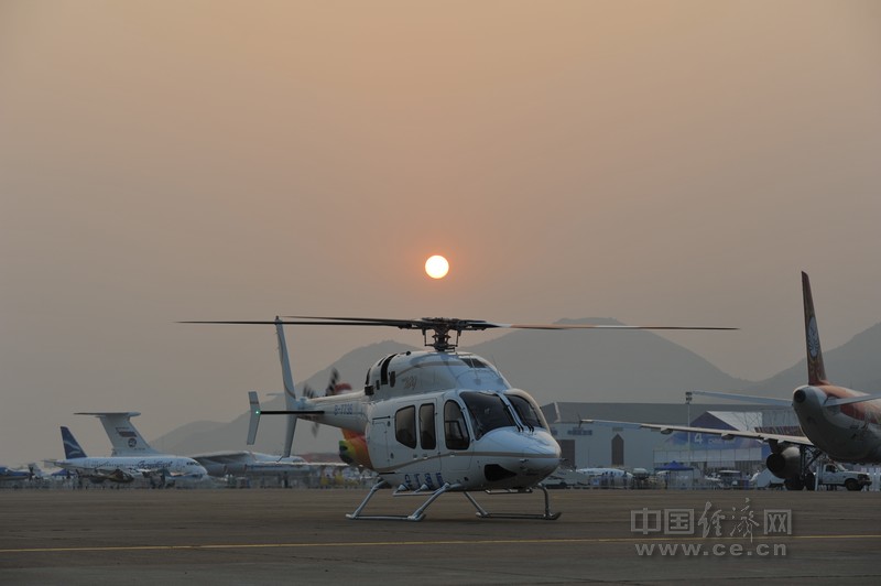 中國經(jīng)濟(jì)網(wǎng)珠海航展特派記者團(tuán)記者王飛 11月15日報道 金匯通航貝爾直升機(jī)在珠海航展上做展示飛行。