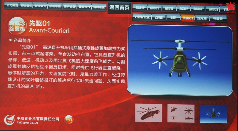 人民網(wǎng)北京11月9日電 (記者 楊鐵虎)中航工業(yè)直升機(jī)公司將在第九屆中國(guó)航展上展出“先驅(qū)01”新概念高速直升機(jī)模型。9日下午,中航工業(yè)直升機(jī)公司的專家向人民網(wǎng)記者介紹說(shuō),“先驅(qū) 01”新概念高速直升機(jī)采用共軸式剛性旋翼加尾推力槳布局,前三點(diǎn)式起落架,單臺(tái)發(fā)動(dòng)機(jī)布置。具備直升機(jī)的懸停、低速、機(jī)動(dòng)以及固定翼飛機(jī)的大速度前飛能力。