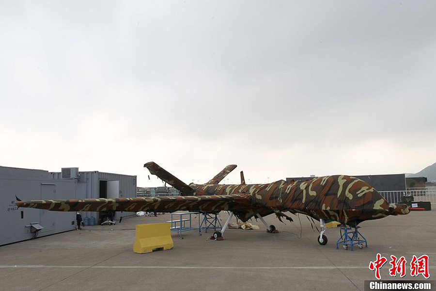曾在前兩屆珠海航展上展出模型的翼龍無人機(jī),在今年航展上以實(shí)物參展。11月8日,該機(jī)已經(jīng)組裝完畢停放在展坪上。該款無人機(jī)由中航工業(yè)旗下成都飛機(jī)設(shè)計(jì)研究所研制,該機(jī)裝有一臺(tái)100馬力活塞發(fā)動(dòng)機(jī),具備全自主平輪式起降和飛行能力,最大起飛重量達(dá)1100公斤,最大續(xù)航時(shí)間為20個(gè)小時(shí),可攜帶各種偵察、激光照射/測距、電子對抗設(shè)備及小型空地打擊武器,可執(zhí)行監(jiān)視、偵查及對地攻擊任務(wù)等任務(wù),也可用于維穩(wěn)、反恐、邊界巡邏等。