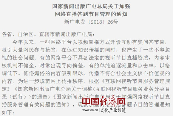 國家新聞出版廣電總局關于加強網(wǎng)絡直播答題節(jié)目管理的通知
