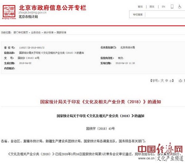 《文化及相關(guān)產(chǎn)業(yè)分類(2018)》已經(jīng)2018年3月16日國家統(tǒng)計局第5次常務(wù)會議審議通過,現(xiàn)印發(fā)給你們,請認真貫徹執(zhí)行。