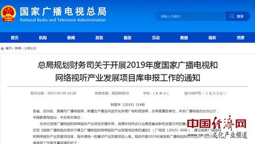 經(jīng)濟(jì)日?qǐng)?bào)-中國經(jīng)濟(jì)網(wǎng)北京9月10日訊 日前,國家廣播電視總局發(fā)布了關(guān)于開展2019年度國家廣播電視和網(wǎng)絡(luò)視聽產(chǎn)業(yè)發(fā)展項(xiàng)目庫申報(bào)工作的通知。通知表明,為充分發(fā)揮廣播電視和網(wǎng)絡(luò)視聽產(chǎn)業(yè)項(xiàng)目支撐作用,培育扶持符合行業(yè)高質(zhì)量創(chuàng)新性發(fā)展方向的重點(diǎn)產(chǎn)業(yè)發(fā)展項(xiàng)目,國家廣播電視總局印發(fā)《國家廣播電視總局關(guān)于建立廣播電視和網(wǎng)絡(luò)視聽產(chǎn)業(yè)發(fā)展項(xiàng)目庫的通知》(廣電發(fā)〔2019〕60號(hào)),建立國家廣播電視和網(wǎng)絡(luò)視聽產(chǎn)業(yè)發(fā)展項(xiàng)目庫,每年遴選一批重點(diǎn)產(chǎn)業(yè)發(fā)展項(xiàng)目入庫。
