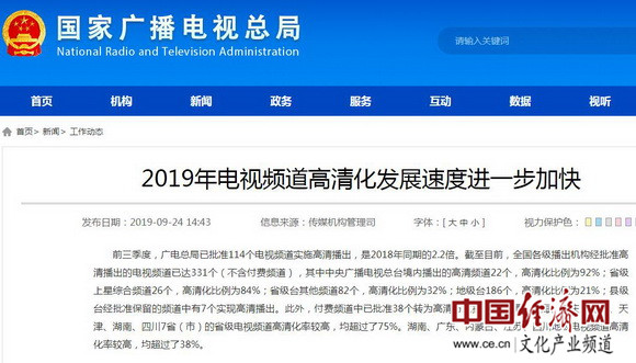 經(jīng)濟(jì)日?qǐng)?bào)-中國(guó)經(jīng)濟(jì)網(wǎng)北京9月25日訊 國(guó)家廣播電視總局傳媒機(jī)構(gòu)管理司發(fā)布信息:前三季度,廣電總局已批準(zhǔn)114個(gè)電視頻道實(shí)施高清播出,是2018年同期的2.2倍。截至目前,全國(guó)各級(jí)播出機(jī)構(gòu)經(jīng)批準(zhǔn)高清播出的電視頻道已達(dá)331個(gè)(不含付費(fèi)頻道),其中中央廣播電視總臺(tái)境內(nèi)播出的高清頻道22個(gè),高清化比例為92%;省級(jí)上星綜合頻道26個(gè),高清化比例為84%;省級(jí)臺(tái)其他頻道82個(gè),高清化比例為32%;地級(jí)臺(tái)186個(gè),高清化比例為21%;縣級(jí)臺(tái)經(jīng)批準(zhǔn)保留的頻道中有7個(gè)實(shí)現(xiàn)高清播出。此外,付費(fèi)頻道中已批準(zhǔn)38個(gè)轉(zhuǎn)為高清方式播出。新疆、上海、重慶、海南、天津、湖南、四川7?。ㄊ校┑氖〖?jí)電視頻道高清化率較高,均超過(guò)了75%。湖南、廣東、內(nèi)蒙古、江蘇、四川地級(jí)電視頻道高清化率較高,均超過(guò)了38%。