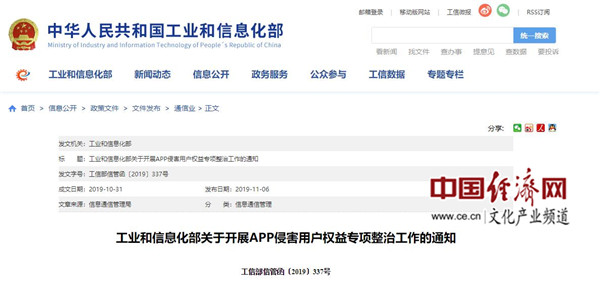 經(jīng)濟(jì)日?qǐng)?bào)-中國(guó)經(jīng)濟(jì)網(wǎng)北京11月26日訊 日前,工業(yè)和信息化部發(fā)布《關(guān)于開(kāi)展APP侵害用戶權(quán)益專項(xiàng)整治工作》的通知,《通知》稱,鑒于當(dāng)前APP違規(guī)收集個(gè)人信息、過(guò)度索權(quán)、頻繁騷擾、侵害用戶權(quán)益等問(wèn)題突出將開(kāi)展專項(xiàng)整治工作,專項(xiàng)整治工作時(shí)間將一直持續(xù)至2019年12月20日。