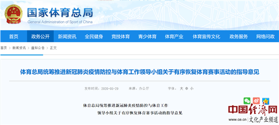 經(jīng)濟日報-中國經(jīng)濟網(wǎng)北京6月3日訊 近日,國家體育總局發(fā)布了《體育總局統(tǒng)籌推進新冠肺炎疫情防控與體育工作領導小組關于有序恢復體育賽事活動的指導意見》(以下簡稱“意見”),意見指出,采取預約、限流等方式,有序開放各類運動場所。  >>>更多政策可查看中國經(jīng)濟網(wǎng)“中國文化產(chǎn)業(yè)政策庫”