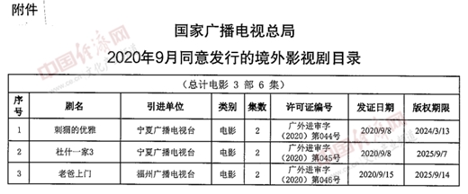 經(jīng)濟(jì)日報(bào)-中國經(jīng)濟(jì)網(wǎng)北京10月27日訊 26日,國家廣播電視總局辦公廳公布2020年9月全國引進(jìn)境外影視劇有關(guān)情況,由寧夏廣播電視臺引進(jìn)的《刺猬的優(yōu)雅》《杜什一家3》,福州廣播電視臺引進(jìn)的《老爸上門》等3部電影,入選《2020年9月同意發(fā)行的境外影視劇目錄》。