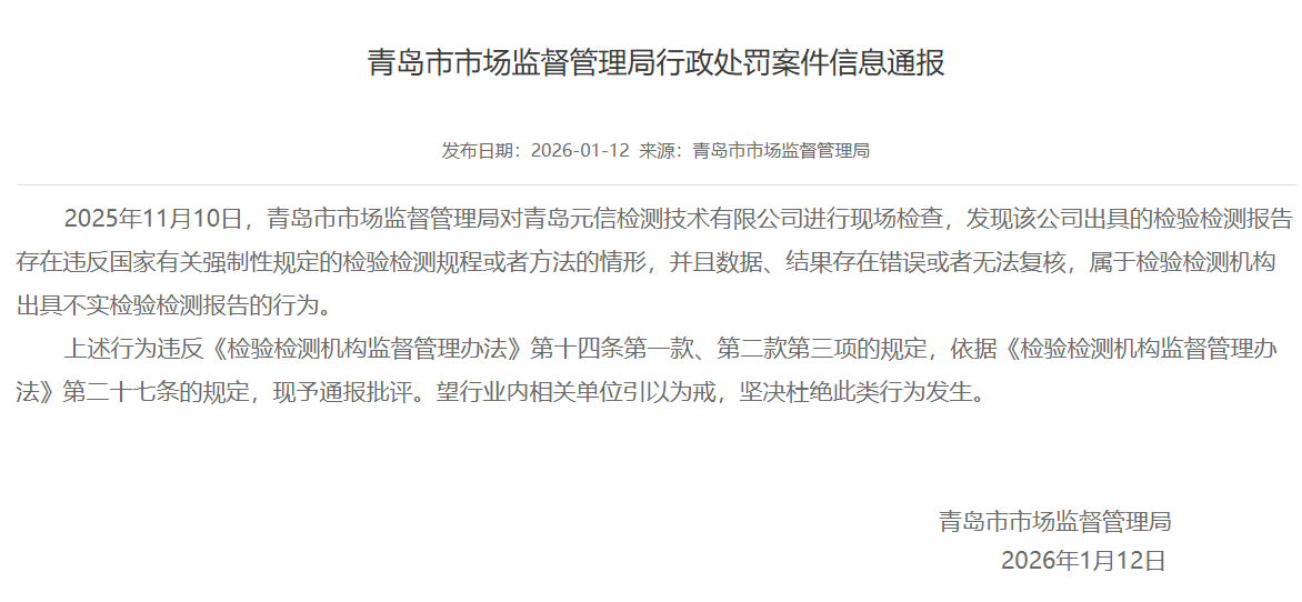 這場圍繞雞蛋角黃素的爭議,最早在今年“3?15”前后引發(fā)廣泛關(guān)注。某打假人連續(xù)發(fā)布檢測報(bào)告,稱在商超渠道購買的多款雞蛋中檢出角黃素,并點(diǎn)名黃天鵝等品牌,正式拉開事件序幕。隨著官方抽檢結(jié)果公布,個(gè)人送檢“檢出角黃素”與官方抽檢“未檢出角黃素”兩種結(jié)論并存,相關(guān)討論也從食品安全本身,進(jìn)一步延伸至檢測報(bào)告的公信力之爭。其中,為某打假人提供檢測報(bào)告的檢測機(jī)構(gòu)合規(guī)性備受質(zhì)疑:據(jù)青島市市場監(jiān)管局公開信息,青島元信檢測技術(shù)有限公司因“出具不實(shí)檢驗(yàn)檢測報(bào)告”“數(shù)據(jù)無法復(fù)核”等問題,已于2026年1月12日被行政處罰。