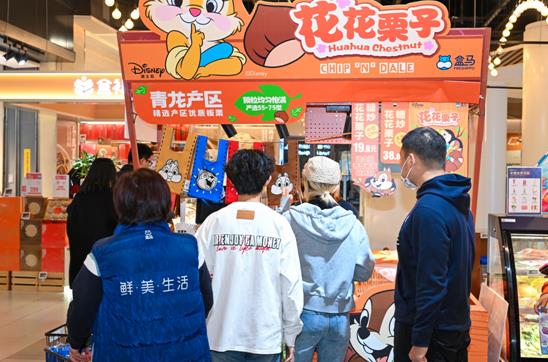 在哈一口氣便能凝結(jié)出霧的寒冬,暖呼呼的糖炒栗子最能溫暖人心。在午后的盒馬線(xiàn)下門(mén)店,糖炒栗子的檔口已經(jīng)排起了長(zhǎng)隊(duì),工作人員將剛炒制出來(lái)的新鮮栗子裝進(jìn)了印有迪士尼人物奇奇蒂蒂形象的紙盒里,遞給消費(fèi)者。“甜甜糯糯的栗子,最適合當(dāng)冬天小零食”、“沖著這個(gè)包裝來(lái)買(mǎi)的,太可愛(ài)了。”