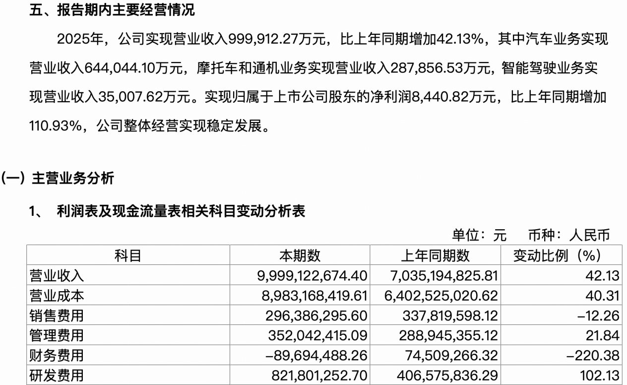 重慶千里科技股份有限公司(以下簡稱“千里科技”)近日發(fā)布2025年年度報告,公司收入、利潤雙增長,“AI+車”商業(yè)化實現(xiàn)突破。報告期內(nèi),全年實現(xiàn)營業(yè)收入99.99億元,同比增長42.13%;歸母凈利潤約0.84億元,同比增長111%。制造業(yè)務(wù)板塊收入達93.19億元,同比增長37.33%。其中,汽車業(yè)務(wù)收入達64.40億元,同比增長52.71%。整車銷量同比增長83.93%;摩托車和通機業(yè)務(wù)收入達28.79億元,摩托車銷量同比增長15.11%;科技業(yè)務(wù)板塊收入達3.50億元。