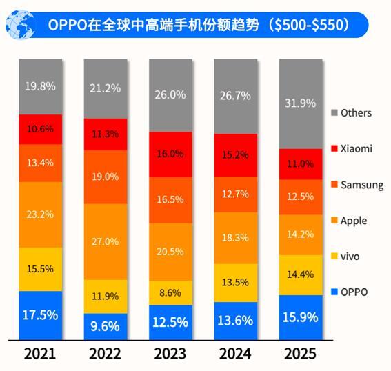500–550 美元是全球智能手機市場公認(rèn)的"高端入口"價格帶,是所有手機廠商的必爭之地。IDC 數(shù)據(jù)顯示,2025 年 OPPO 在這一價格段的全球市場份額已穩(wěn)居行業(yè)第一,成為該價格區(qū)間市場領(lǐng)導(dǎo)者。
