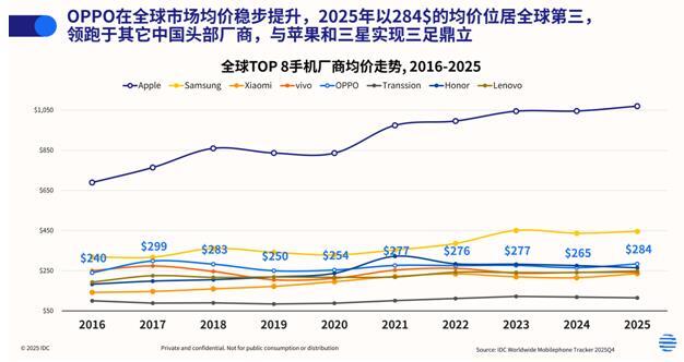 均價是衡量品牌高端化成色最直接的標(biāo)尺。IDC 數(shù)據(jù)顯示,2025 年 OPPO 全球智能手機均價達(dá) 284 美元,在全球出貨量 TOP 8 廠商中僅次于蘋果與三星,位列第三,同時以顯著優(yōu)勢領(lǐng)跑所有其他中國頭部手機品牌。