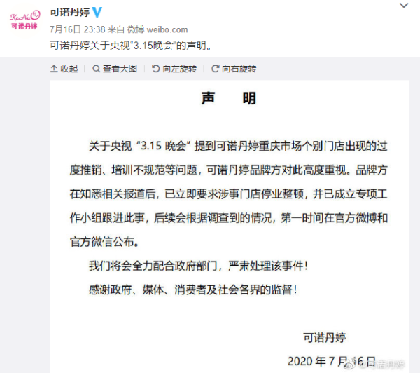 昨日晚間,可諾丹婷針對 315 晚會報道作出回應??芍Z丹婷表示,關于央視“3.15晚會”提到可諾丹婷重慶市場個別門店出現(xiàn)的過度推銷、培訓不規(guī)范等問題,可諾丹婷品牌方對此高度重視。品牌方在知悉相關報道后,已立即要求涉事門店停業(yè)整頓,并已成立專項工作小組跟進此事,后續(xù)會根據(jù)調查到的情況,第一時間在官方微博和官方微信公布。