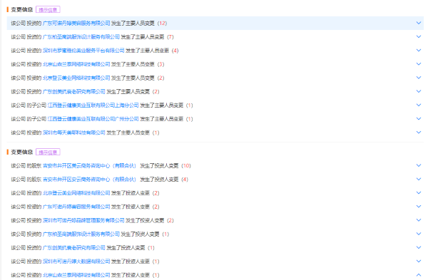 值得注意的是,天眼查顯示,近年來,江西登云健康美業(yè)互聯(lián)有限公司多名股東企業(yè)及多家投資企業(yè)主要人員變動頻繁。如,2016年以來,該公司投資的廣東可諾丹婷美容服務有限公司發(fā)生主要人員變更累計12次;該公司的股東吉安市井開區(qū)美云商務咨詢中心(有限合伙)發(fā)生投資人變更累計10次。