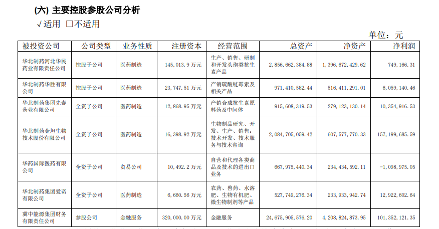 具體來看,參股子公司華北制藥河北華民藥業(yè)有限責任公司主營頭孢類抗生素產品。報告期內,其實現(xiàn)營業(yè)收入54673萬元,同比降低23795萬元,降低30.32%;實現(xiàn)主營業(yè)務利潤12237萬元,毛利率同比降低14.23%。