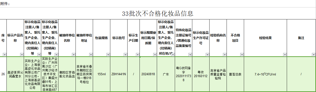 中國經(jīng)濟網(wǎng)北京11月16日訊(記者楊奇奇)11月15日,國家藥監(jiān)局發(fā)布《關(guān)于33批次不合格化妝品的通告》顯示,1批次高姿澎湃沁潤晶瑩水不合格。