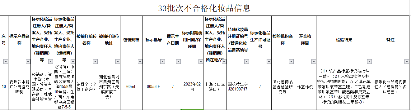 1批次安熱沙防曬霜不合格資生堂否認(rèn)經(jīng)營(yíng)