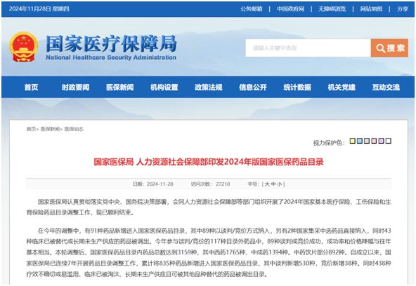 2024年醫(yī)保目錄調(diào)整從7月1日正式啟動(dòng),是國(guó)家醫(yī)保局成立以來(lái)的第7次國(guó)家醫(yī)保藥品目錄調(diào)整,將于2025年1月1日起實(shí)施。發(fā)布會(huì)上,國(guó)家醫(yī)保局醫(yī)藥服務(wù)管理司司長(zhǎng)黃心宇介紹,今年目錄調(diào)整范圍以新藥為主,新增的91種藥品中有90種為5年內(nèi)新上市品種。國(guó)家醫(yī)保局將包括1類化藥、1類治療用生物制品、1類和3類中成藥在內(nèi)的“全球新”作為重點(diǎn)支持對(duì)象,確?!昂娩撚迷诘度猩稀?。