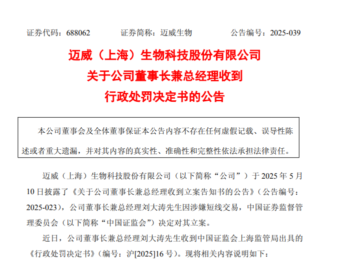 中國經濟網北京8月7日訊(記者 郭文培)8月5日,邁威(上海)生物科技股份有限公司(以下簡稱邁威生物)披露公告,由于短線交易,近日公司董事長兼總經理劉大濤收到中國證監(jiān)會上海監(jiān)管局出具的《行政處罰決定書》,劉大濤被警告并處以六十萬元罰款。