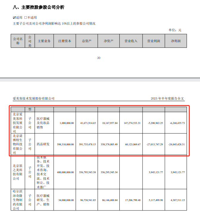 具體來看,其主要控股參股公司表現(xiàn)并不樂觀。半年報(bào)顯示,愛美客主要子公司及對公司凈利潤影響達(dá)10%以上的參股公司有4家,其中2家處于虧損狀態(tài)。北京愛美客科技發(fā)展有限公司凈利潤為-6268435.73元,北京諾博特生物科技有限公司凈利潤為-24045428.31元,2家虧損金額逾3000萬元。
