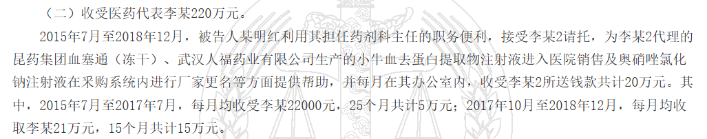 根據(jù)判決書,2015年7月至2018年12月,被告人某明紅利用其擔(dān)任藥劑科主任的職務(wù)便利,接受“李某2”請托,為“李某2”代理的昆藥集團血塞通(凍干)、武漢人福藥業(yè)有限公司生產(chǎn)的小牛血去蛋白提取物注射液進入醫(yī)院銷售及奧硝唑氯化鈉注射液在釆購系統(tǒng)內(nèi)進行廠家更名等方面提供幫助,并每月在其辦公室內(nèi),收受“李某2”所送錢款共計20萬元。