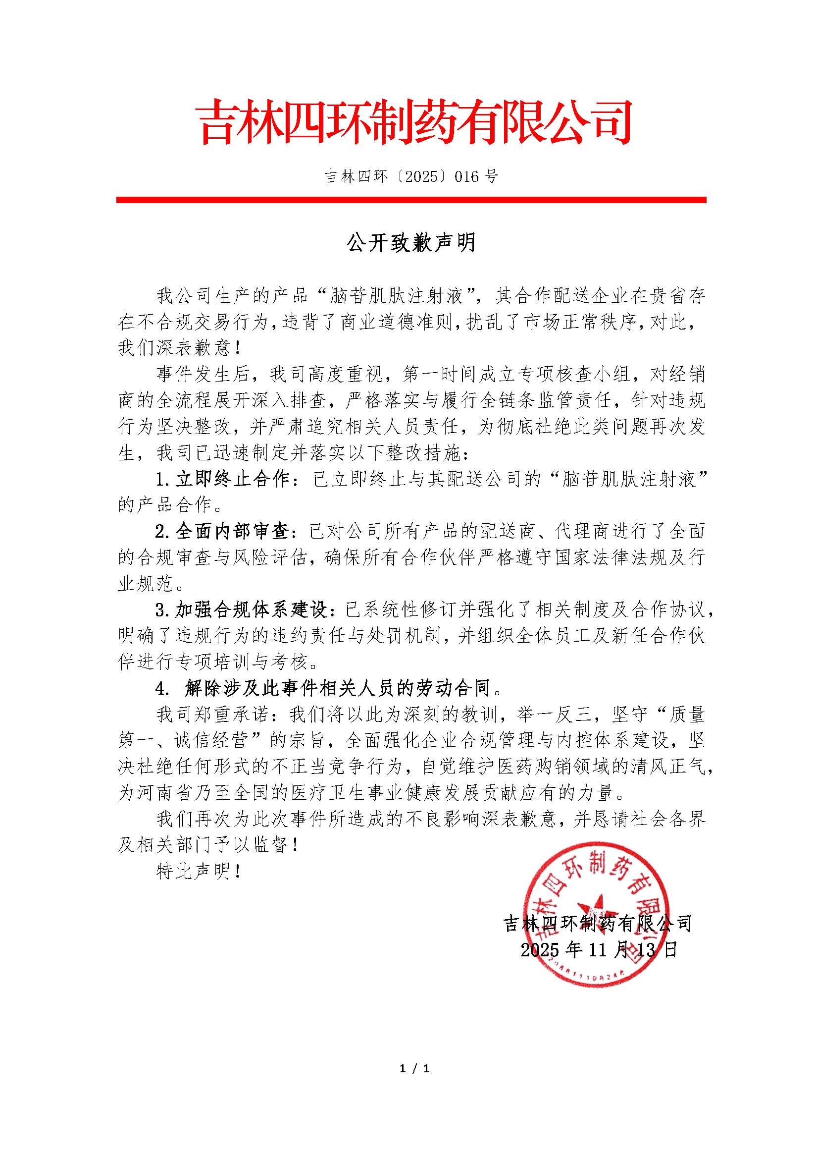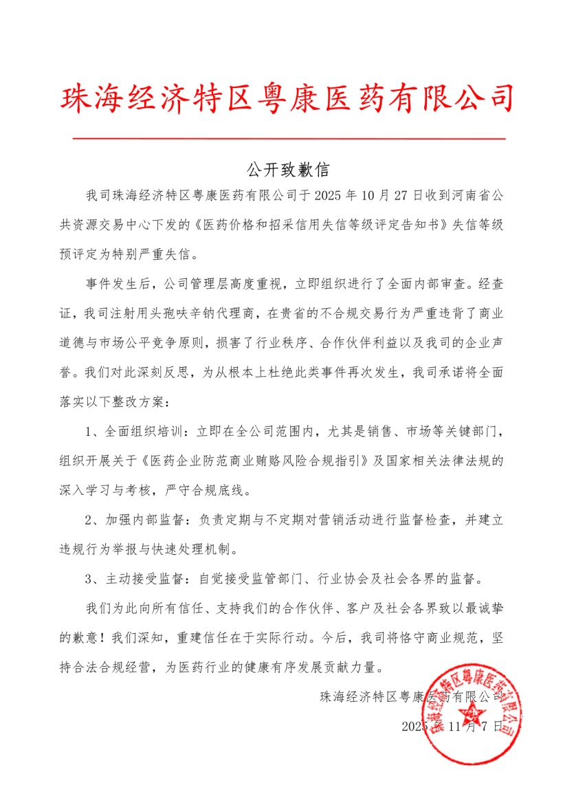 根據(jù)公開致歉信,在涉及哈爾濱譽衡制藥有限公司產(chǎn)品的配送環(huán)節(jié)中,相關配送企業(yè)存在不合規(guī)的交易行為。吉林四環(huán)制藥有限公司生產(chǎn)的產(chǎn)品“腦苷肌肽注射液”,其合作配送企業(yè)在河南省存在不合規(guī)交易行為。珠海經(jīng)濟特區(qū)粵康醫(yī)藥有限公司注射用頭孢呋辛鈉代理商,在河南省發(fā)生不合規(guī)交易行為,粵康醫(yī)藥收到河南省公共資源交易中心下發(fā)的《醫(yī)藥價格和招采信用失信等級評定告知書》失信等級預評定為特別嚴重失信。