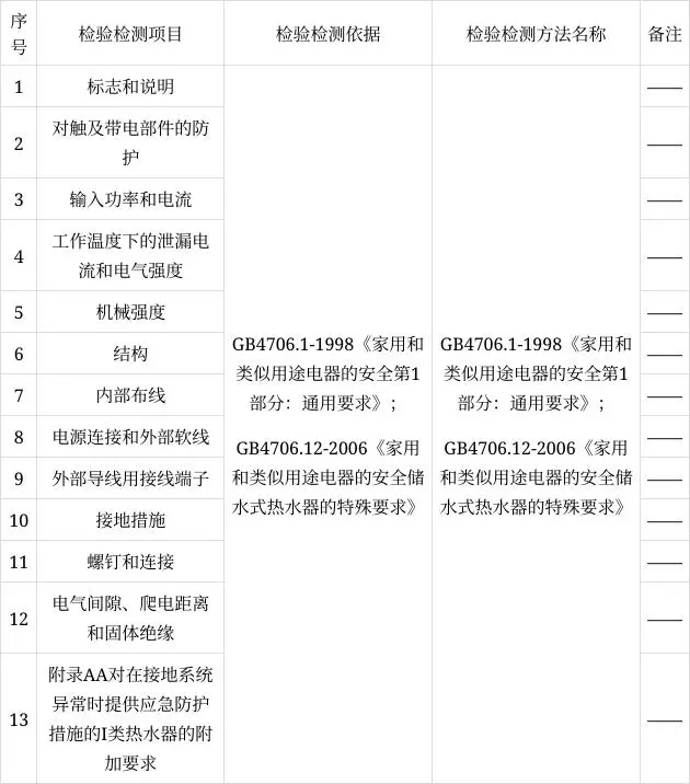 表2 儲(chǔ)水式電熱水器產(chǎn)品檢驗(yàn)檢測(cè)項(xiàng)目及依據(jù)