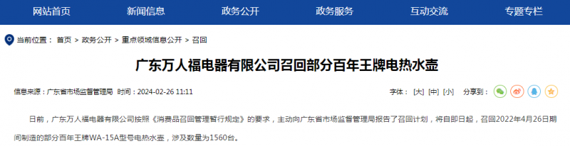 日前,廣東萬人福電器有限公司按照《消費品召回管理暫行規(guī)定》的要求,主動向廣東省市場監(jiān)督管理局報告了召回計劃,將自即日起,召回2022年4月26日期間制造的部分百年王牌WA-15A型號電熱水壺,涉及數(shù)量為1560臺。
