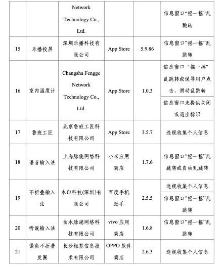 工信部稱,依據(jù)《個人信息保護法》《網(wǎng)絡(luò)安全法》《電信條例》《電信和互聯(lián)網(wǎng)用戶個人信息保護規(guī)定》等法律法規(guī),工信部持續(xù)整治APP侵害用戶權(quán)益的違規(guī)行為,在近期組織的第三方檢測機構(gòu)進行抽查中,共發(fā)現(xiàn)27款A(yù)PP及SDK存在侵害用戶權(quán)益行為。侵權(quán)方式包括信息窗口“搖一搖”亂跳轉(zhuǎn)或誤導(dǎo)用戶滑動亂跳轉(zhuǎn)、違規(guī)收集個人信息、APP頻繁自啟動和關(guān)聯(lián)啟動、信息窗口未提供關(guān)閉或退出標識、強制用戶使用定向推送功能、SDK信息公示不到位以及強制、頻繁、過度索取權(quán)限等,涉及小米商店語音輸入法、vivo應(yīng)用商店的聽說輸入法、App Stroe的樂播投屏等。