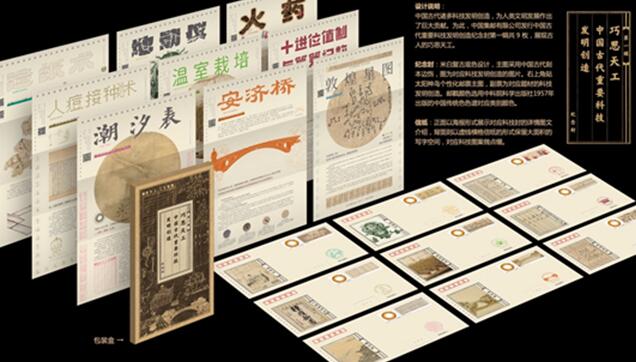 《古代科技封》基于中國科學院自然科學史研究所階段性研究成果“中國古代重要科技發(fā)明創(chuàng)造”88項,其中分為科學發(fā)現(xiàn)與創(chuàng)造(30項)、技術發(fā)明(45項)、工程成就(13項)三大類,農(nóng)學與紡織、數(shù)學、天文、醫(yī)藥學、材料與制器、機器與儀器、車船火藥與火器、土木工程、光學地學與韻律學九大類別。