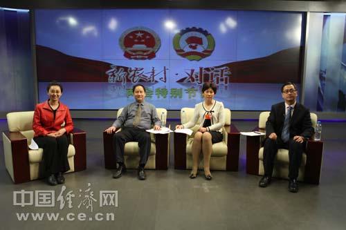 第十一屆全國人大代表、山東臨沭縣農(nóng)業(yè)局農(nóng)經(jīng)中心主任劉建文,農(nóng)業(yè)部全國農(nóng)業(yè)技術(shù)推廣服務(wù)中心土肥處處長李榮,國家緩控釋肥工程技術(shù)研究中心副主任、山東金正大公司副總經(jīng)理陳宏坤做客中國經(jīng)濟(jì)網(wǎng)。(王耀峰 攝)