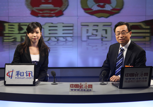 全國人大代表、山東禹王實(shí)業(yè)有限公司董事長(zhǎng)兼總裁劉錫潛(右)做客中國經(jīng)濟(jì)網(wǎng)(王耀峰 攝)