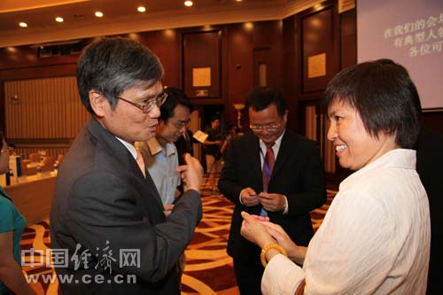 2013年全國(guó)食品安全宣傳周啟動(dòng)儀式暨第五屆中國(guó)食品安全論壇6月17日在北京舉辦,今年主題為“社會(huì)共治 同心攜手維護(hù)食品安全”。圖為康師傅中央研究所所長(zhǎng)楊乾輝與中國(guó)飲料工業(yè)協(xié)會(huì)理事長(zhǎng)趙亞利進(jìn)行交流。 中國(guó)經(jīng)濟(jì)網(wǎng) 郝紅波/攝