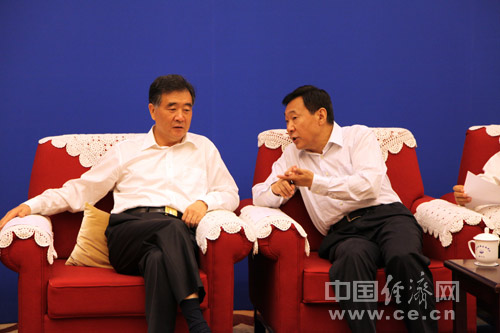 6月17日,以“社會(huì)共治、同心攜手維護(hù)食品安全”為主題的2013年全國(guó)食品安全宣傳周主場(chǎng)活動(dòng)在北京舉行。國(guó)務(wù)院副總理汪洋出席活動(dòng)并講話。圖為國(guó)務(wù)院副總理汪洋與國(guó)家食品藥品監(jiān)督管理總局局長(zhǎng)張勇交流。 中國(guó)經(jīng)濟(jì)網(wǎng) 王耀峰/攝