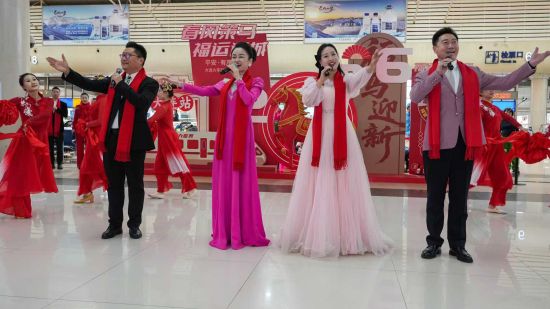 上午8時(shí)30分,大連北站候車大廳早已客流涌動(dòng),大連市總工會(huì)“心連心”藝術(shù)團(tuán)的歌舞《把福帶回家》率先登場(chǎng),歡快的旋律瞬間點(diǎn)燃現(xiàn)場(chǎng)氣氛。男聲獨(dú)唱《西部放歌》、《咱老百姓》婉轉(zhuǎn)悠揚(yáng),女聲二重唱《珊瑚頌》娓娓動(dòng)聽(tīng),最后一曲歌伴舞《走進(jìn)春天》大合唱引發(fā)全場(chǎng)共鳴,旅客們紛紛駐足鼓掌,用掌聲回應(yīng)這份冬日里的熱忱。與此同時(shí),互動(dòng)區(qū)域已熱鬧開(kāi)鑼,“一馬當(dāng)先,把福帶走”活動(dòng)臺(tái)前,車站工作人員和青年志愿者引導(dǎo)旅客掃碼關(guān)注“濱城老鐵”賬號(hào),領(lǐng)取馬年限定蓋章本,打卡拍照墻“我在大連,馬上就回家”的路標(biāo)文案,道出了無(wú)數(shù)游子的心聲。