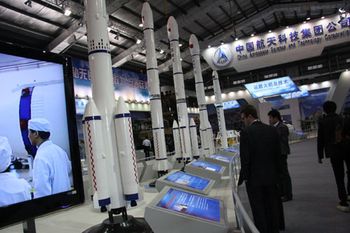 即將于2014年實(shí)現(xiàn)首飛的新一代大運(yùn)載火箭“長征五號”模型高高地矗立著。“長二F”、“長三甲”、“長四乙”等白色箭體模型緊隨其后,一字排開,場面蔚為壯觀。很多電視媒體在采訪時,都有意識地將長征火箭或者“天宮一號”的模型作為背景。